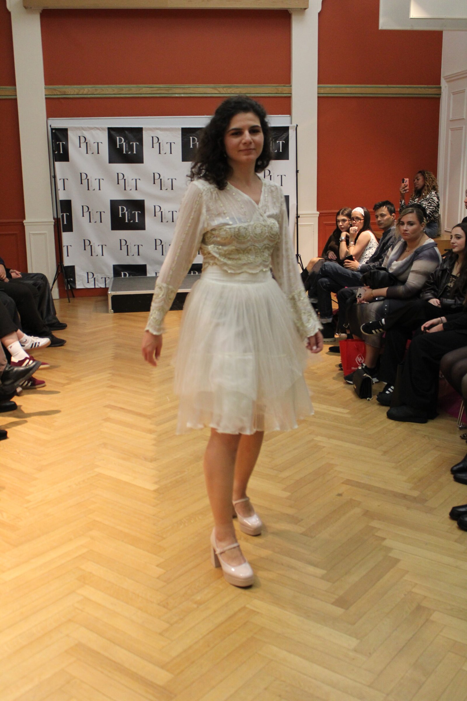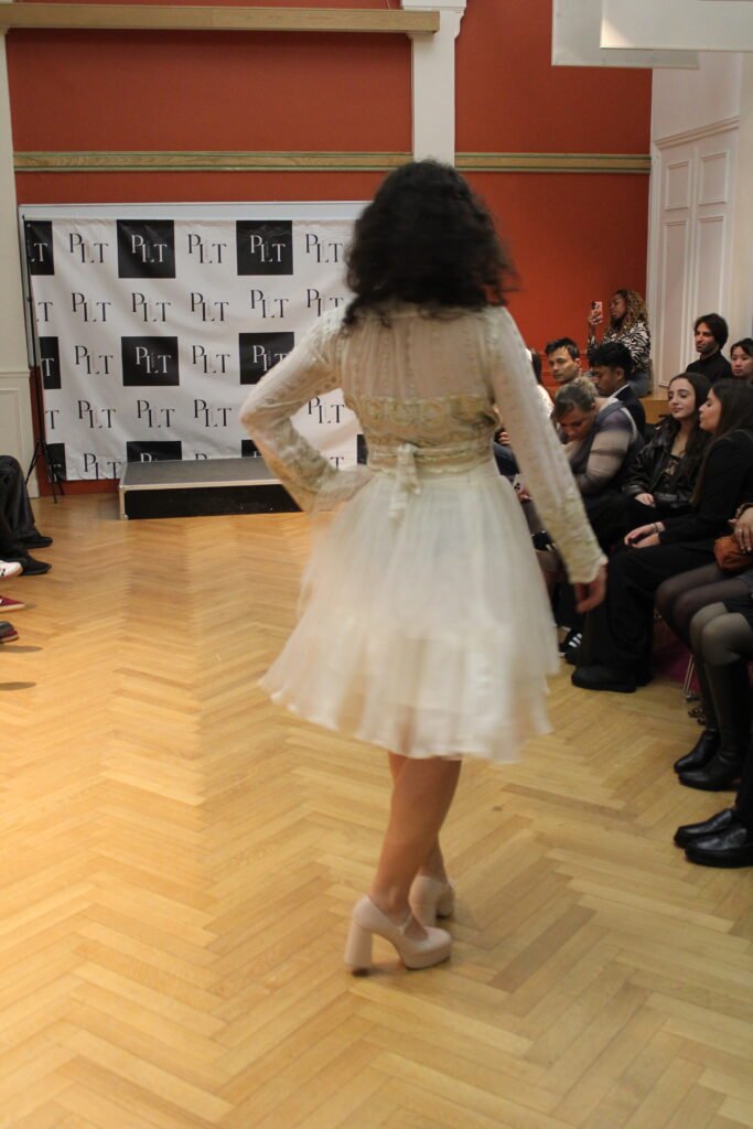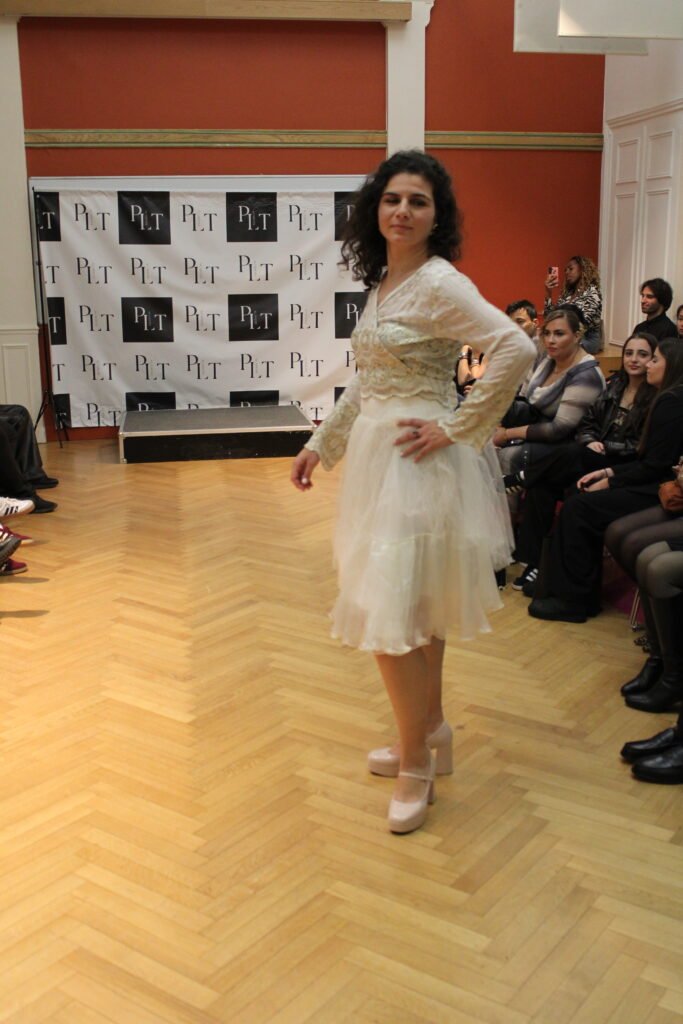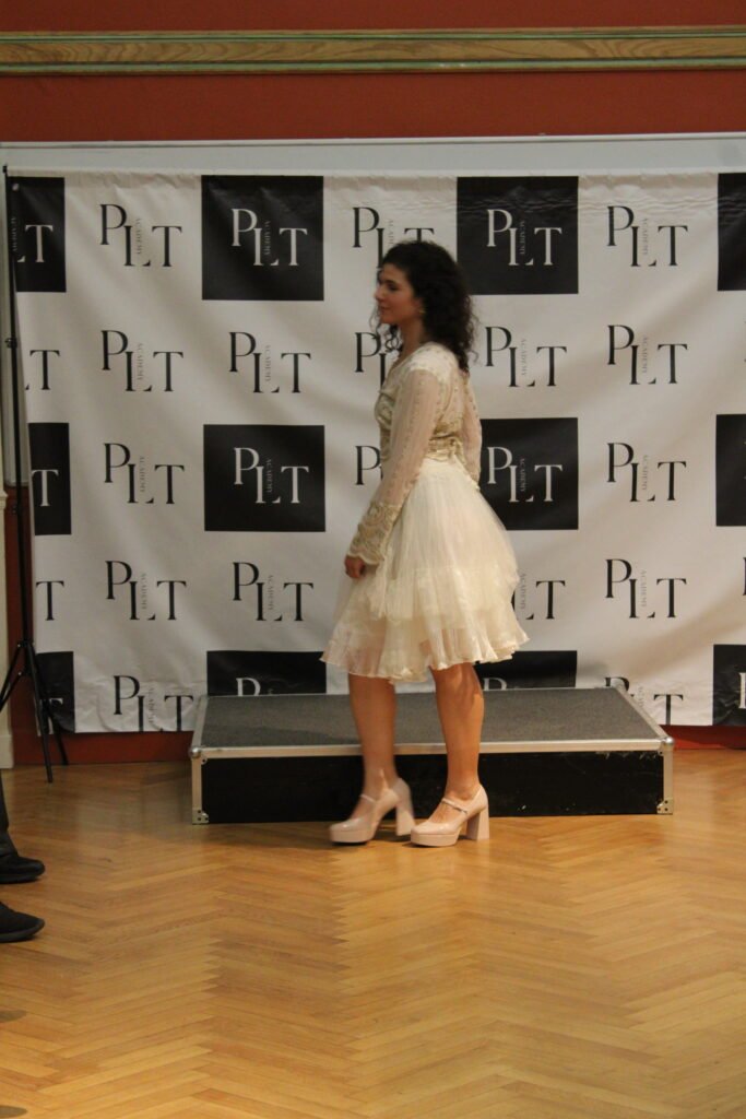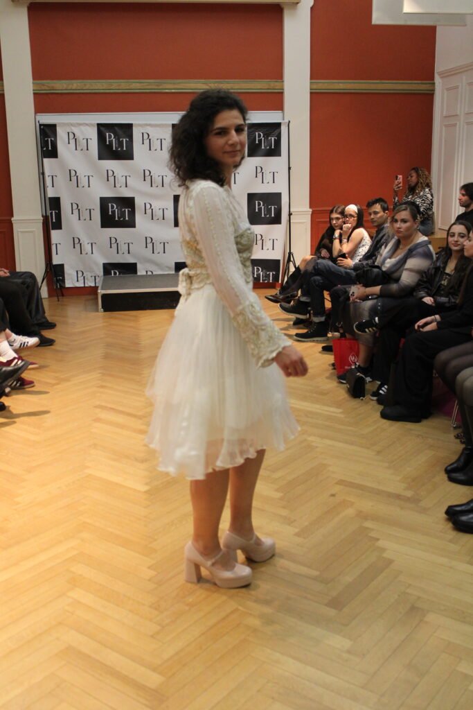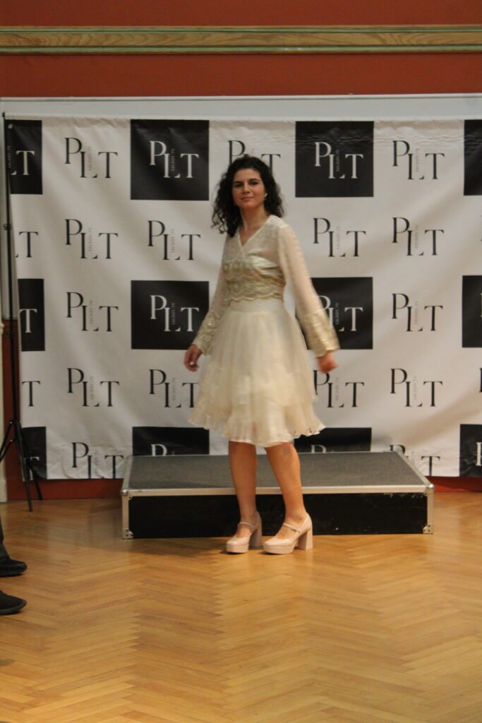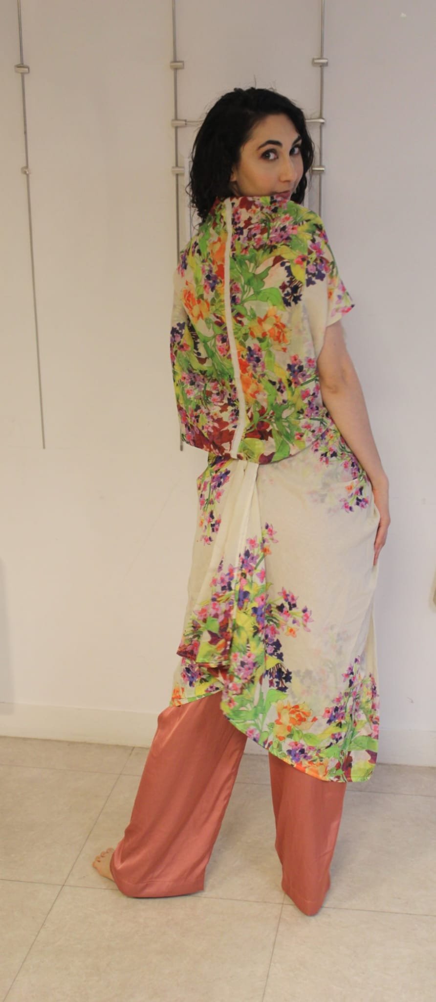“ L’ensemble Priyanka relève d’un travail d’orfèvre en couture! La robe et le haut sont des tissus originellement démontés d’autres tenues, car, amoureuse de leur texture, je souhaitais les récupérer en faire un ensemble virevoltant. Ces matières étaient précieuses, tant par leur histoire que par la qualité des tissus, brodés de fil d’or et superposés pour un effet virevoltant”.