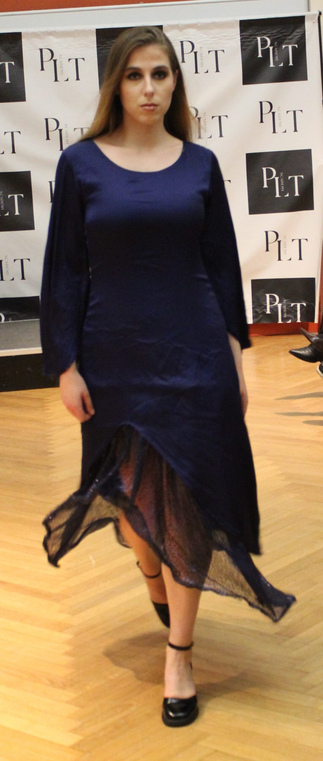 “Yasmina est une robe bleue nuit, en soie, près du corps et ample au niveau des manches, féerique et flottante. La sous robe est en paillettes bleue nuit, et grâce à ses cerceaux oscille aux mouvements de votre corps. Un univers des milles et unes nuits entre tradition et originalité. Pour la construire et trouver l’arc de cereaux idéal, nous avons fait avec mon mari milles boutiques, avant de finir dans une boutique de bricolage. Un grand moment de rire ! “
