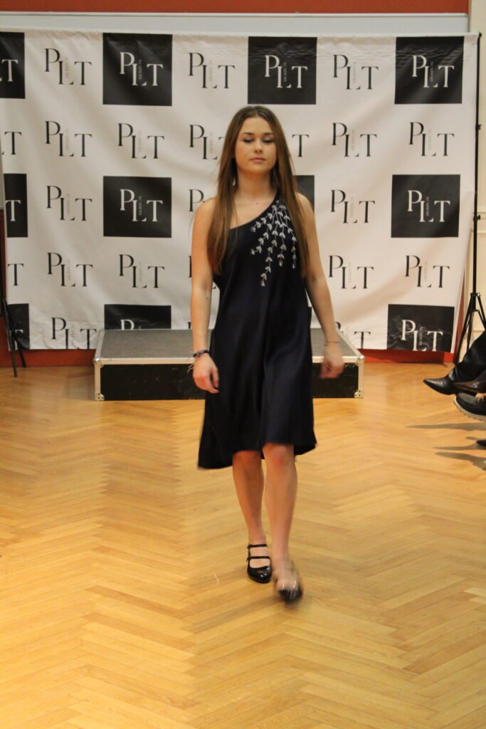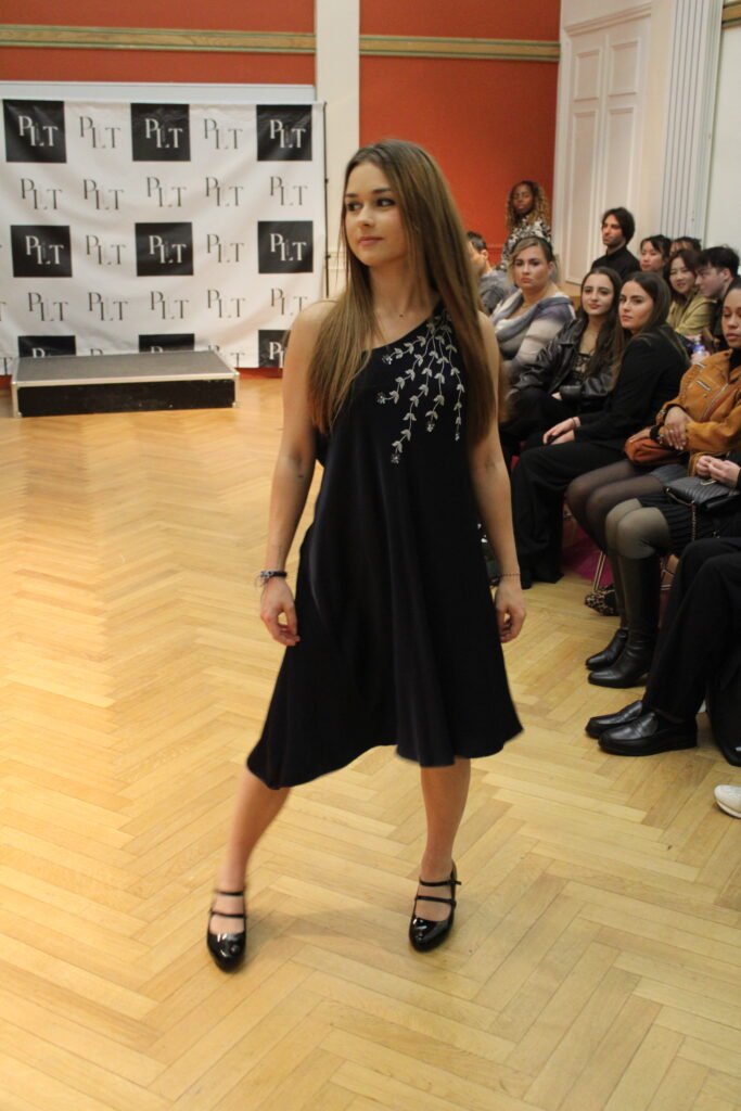 “Cette robe fait partie des créations durant lesquelles l’esprit divague, imagine et vogue ailleurs. J’ai vu une jupe longue et j’ai adoré son mouvement, lourd et souple, la profondeur que cela donnait à chaque pas, comme des vagues majestueuses, se brisant en écume, et recommençant. Pour reproduire cet effet sur une robe courte, j’ai travaillé le drapé depuis l’asymétrie de l’épaule afin de tout couper et coudre en biais pour avoir ce mouvement incessant du tissu. Il fallait ensuite rehausser ce caractère pesant avec cette broderie faite main, oscillant et nageant dans les profondeurs bleu nuit”