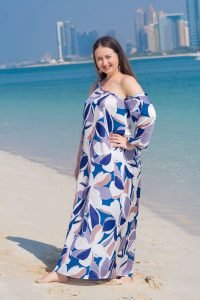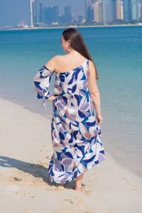 “Olivia, c’est une promenade en bateau, seuls au milieu de l’océan infini. La mer brûlante, le soleil qui éblouit. Les couleurs de la robe se confondent entre mer et ciel. La forme est épurée, flottante. Elle s’enfile en un instant, sortant de l’eau. Elle habille en un rien de temps. Elle protège des rayons du soleil. Sa soie laisse respirer la peau, dorée au soleil. Elle est liberté et rêve. “