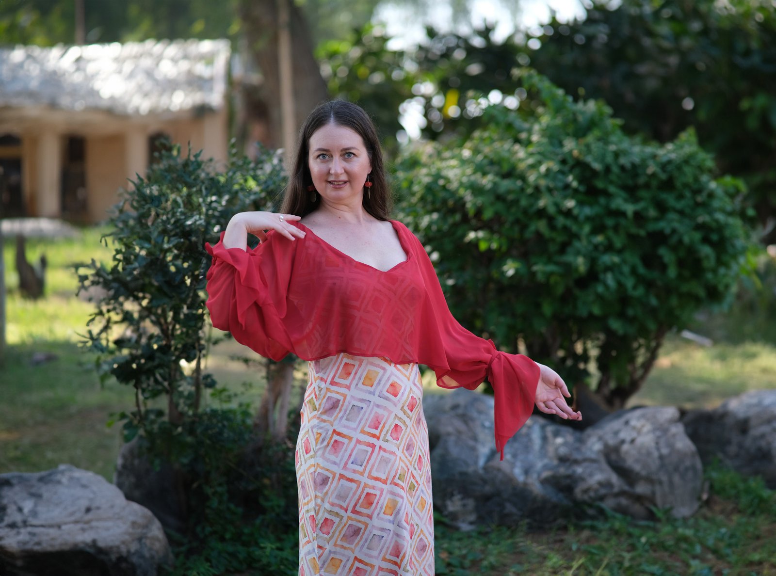 “La robe Sabah, “jour qui se lève” devait être enveloppée de brume, d’un voile flottant aux couleurs vives comme le jour arrivant mais encore suaves et transparentes, comme la nuit qui s’éteint. Cette robe, en coton très confortable, à léger motif se pare d’un voile d’épaule à assortir à votre goût: tantôt rouge, tantôt orange selon votre humeur. Si une autre couleur vous inspire, nous pouvons aussi créer le voilage sur mesure, quant à votre goût. Pour toute tenue commandée, est inclus e la robe et 2 voilages”
