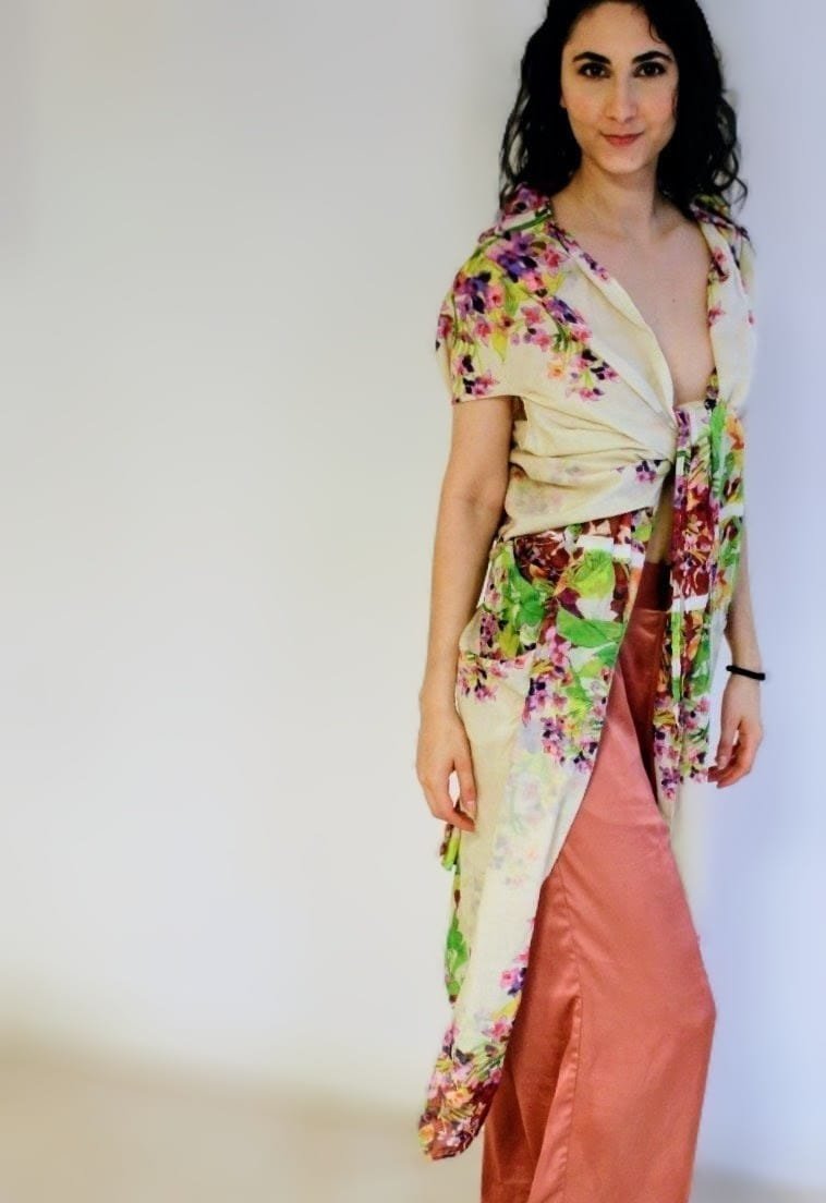 “Sita est la représentation de Lakshmi, l’épouse de Vishnou, dieu emblématique de la trinité indienne. Je la voyais audacieuse, discrète, raffinée, sensuelle, discrète et traditionnelle. La robe, fleurie, est légère et composée d’un tissu flottant, à positionner à gauche ou à droite, sur l’épaule de votre choix, comme un sari traditionnel. Elle se ferme par 2 petits boutons, cachés, assurant mouvement et fluidité. Elle peut être retroussée, dégageant les 2 bras, pour plus de dynamisme ou couvrant l’épaule, pour une magnifique mouvement dansant traditionnel.Elle se porte ainsi de jour comme de nuit. “
